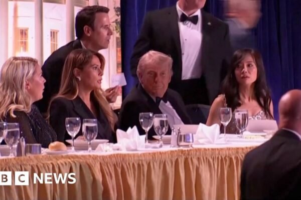 US President Donald Trump was rushed to safety from the White House Correspondents’ Dinner after suspected gunshots rang out at the venue. The President and First Lady Melania Trump appeared to be part way through a conversation at the Washington Hilton when he was interrupted by a commotion at the White House table. Loud bangs…